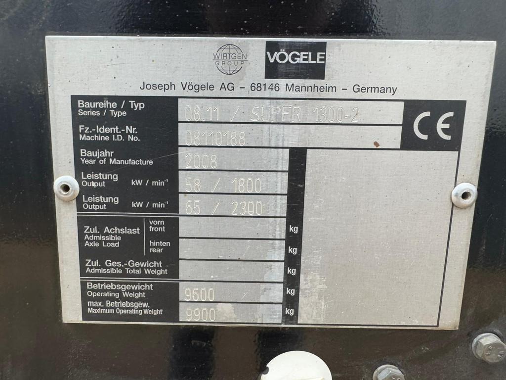 Used Vögele Super 1300-2 Asphalt Paver – 2008 – For Sale at BIG Machinery This Vögele Super 1300-2 asphalt paver is available for sale at BIG Machinery in the Netherlands. Manufactured in Germany in 2008, this machine has 3,363 operating hours and is CE certified. It is in good working condition and ready for paving operations. The paver is equipped with two 40 cm extensions, providing a standard paving range of 1,700 mm and a maximum paving range of 3,800 mm. It features Vögele single sonic sensors (MOBA Sonic with 3 sensors), Vögele slope sensor, and Vögele auger sensors for accurate and consistent paving results. The machine is powered by a Deutz BF4M engine delivering 58 kW, ensuring reliable and efficient performance on site. This asphalt paver offers precision, efficiency, and proven German engineering — ideal for road construction and infrastructure projects. Specifications • Year: 2008 • Country of manufacture: Germany • Operating hours: 3,363 • Certification: CE • Engine: Deutz BF4M • Engine power: 58 kW • Standard paving range: 1,700 mm • Maximum paving range: 3,800 mm • Extensions: 2 x 40 cm • Vögele single sonic sensors (MOBA, 3 sensors) • Vögele slope sensor • Vögele auger sensors • Condition: Used Interested in this Vögele Super 1300-2 asphalt paver? Contact BIG Machinery for more information, inspection details or a quotation. We deliver worldwide and can arrange complete export documentation and transport from our headquarters in the Netherlands. Why Choose BIG Machinery? At BIG Machinery, you benefit from over 30 years of experience in the trade of new and used machines. With our headquarters in the Netherlands, a dedicated and cohesive team, and extensive expertise in sea transport, we ensure reliable and fast delivery worldwide. We stand out with our competitive market prices, carefully selected machine quality, and the assurance of a long-term partnership. With our own transport services, we provide seamless and efficient service from start to finish. Choose BIG Machinery as your trusted partner and discover why we are the preferred choice for customers worldwide. Quality, speed, and reliability – Buy BIG! = More information = Power: 58 kW (79 HP) Empty weight: 9.600 kg