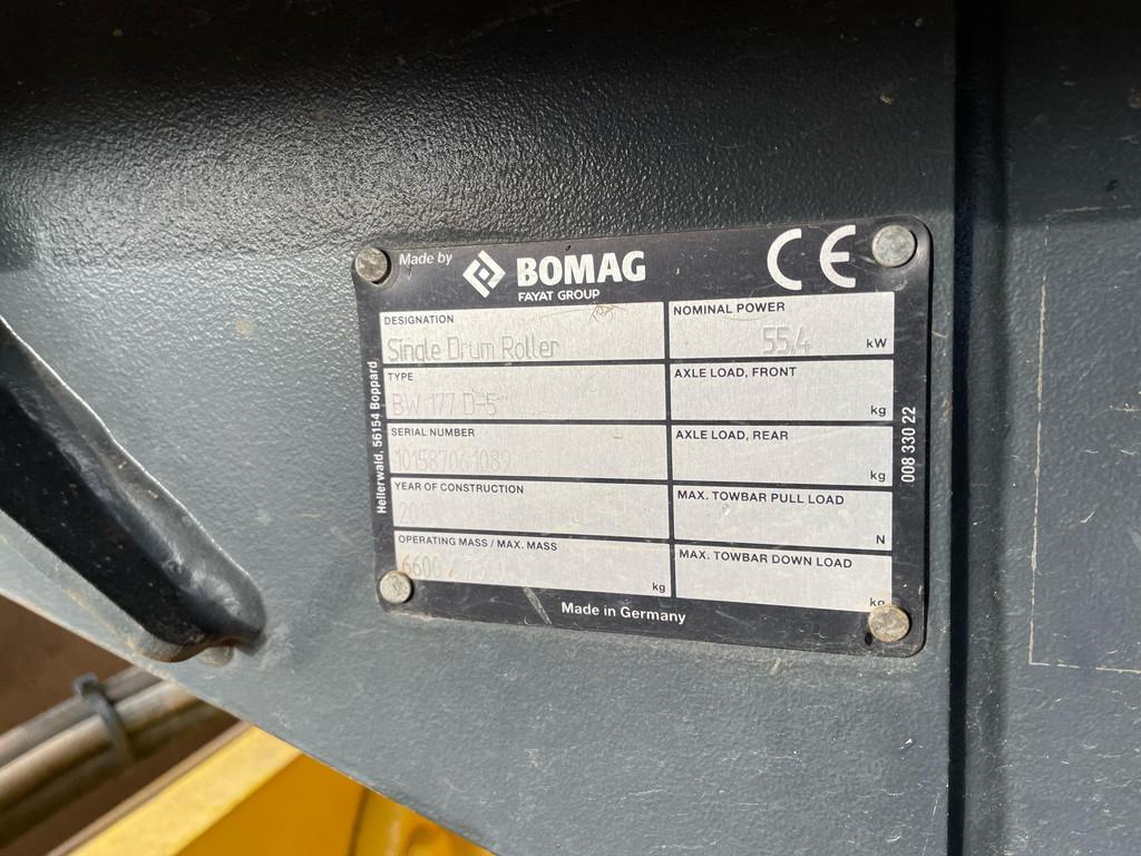Used Bomag BW177D-5 Roller – 2019 | For Sale at BIG Machinery This Bomag BW177D-5 Roller is now available for sale at BIG Machinery in the Netherlands. The machine is made in Germany (2019) and is powered by a Kubota V3307-T engine delivering 55 kW. It features drum width of 1,686 mm, 80% tyre condition, and air conditioning, making it ideal for road construction and compaction applications. Additional features include CE certification, EPA 2019 compliance, EU Stage V / Tier 4F emission standard, Comfort package, radio, Bomag TERRAMETER, and Bomag TR-391 14.9-24 tyres. - Condition: Used - Engine model: Kubota V3307-T - Engine power: 55 kW - Drum width: 1,686 mm - Tyres: Bomag TR-391 14.9-24 – 80% - Air conditioning - Comfort package - Bomag TERRAMETER - Emissions: EU Stage V / Tier 4F, EPA 2019 - CE Certified: Yes - Year: 2019 Interested in this Bomag BW177D-5 Roller? Contact BIG Machinery for more information, inspection details, or a quotation. We deliver worldwide and can arrange complete export documentation and transport from our headquarters in the Netherlands. Why Choose BIG Machinery? At BIG Machinery, you benefit from over 30 years of experience in the trade of new and used machines. With our headquarters in the Netherlands, a dedicated and cohesive team, and extensive expertise in sea transport, we ensure reliable and fast delivery worldwide. We stand out with our competitive market prices, carefully selected machine quality, and the assurance of a long-term partnership. With our own transport services, we provide seamless and efficient service from start to finish. Choose BIG Machinery as your trusted partner and discover why we are the preferred choice for customers worldwide. Quality, speed, and reliability – Buy BIG! = More information = Drive: Wheel Empty weight: 6.600 kg Tyres: 80% Emissions / Stage: V