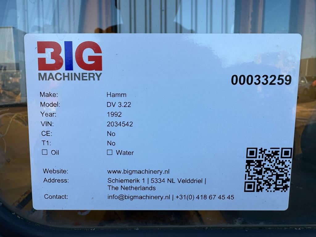 Used Hamm DV 3.22 Roller – 1992 | For Sale at BIG Machinery This Hamm DV 3.22 Roller is now available for sale at BIG Machinery in the Netherlands. The machine is made in Germany (1992) and has 8,258 operating hours. It is powered by a 2L 40 S engine delivering 22 kW, with an operating weight of 3,800 kg. Equipped with a closed cabin and drum drive, this roller is ideal for small-scale compaction and construction applications. Runs on diesel. - Condition: Used - Engine model: 2L 40 S - Engine power: 22 kW - Operating weight: 3,800 kg - Operating hours: 8,258 - Cabin: Closed - Drive type: Drum drive - Fuel type: Diesel - Year: 1992 Interested in this Hamm DV 3.22 Roller? Contact BIG Machinery for more information, inspection details, or a quotation. We deliver worldwide and can arrange complete export documentation and transport from our headquarters in the Netherlands. Why Choose BIG Machinery? At BIG Machinery, you benefit from over 30 years of experience in the trade of new and used machines. With our headquarters in the Netherlands, a dedicated and cohesive team, and extensive expertise in sea transport, we ensure reliable and fast delivery worldwide. We stand out with our competitive market prices, carefully selected machine quality, and the assurance of a long-term partnership. With our own transport services, we provide seamless and efficient service from start to finish. Choose BIG Machinery as your trusted partner and discover why we are the preferred choice for customers worldwide. Quality, speed, and reliability – Buy BIG! = More information = Empty weight: 3.800 kg
