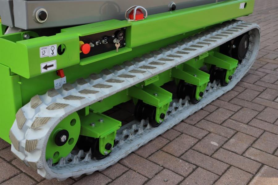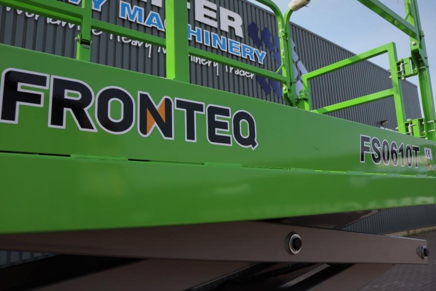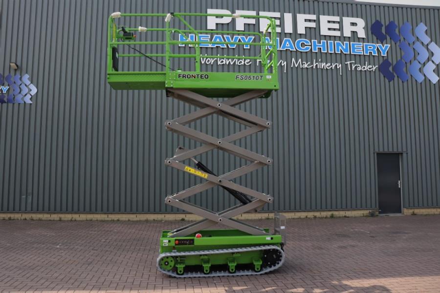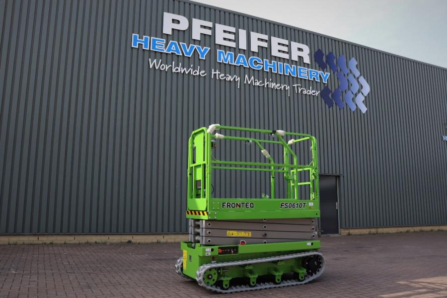 FRONTEQ FS0610T 8m Electric Tracked Scissor Lift CE (Declaration of Conformity). Manufacturer: FRONTEQ Typ: FS0610T Serial nr: FST102100007S Building year: 2021 Fuel: Electric Length (Platform unextended) 1.80 m Platform Width: 0.78 m Ground Clearance: 0.14 m Lift Capacity: 200 kg Turning Radius (Inside) 0 Turning Radius (Outside) 0.75 m Hydraulic Tank Capacity 0.7 gal 2.5 L Overall Weight: 1.620 kg PLATFORM Extended platform Folding guardrails Self-locked swing gate half Height SAFETY Pothole protection Motion alarm Tilt level sensor with an audible alarm Automotive-style horn Descent protection alarm Dual flashing beacons Manual braking release Safety arm Emergency lowering Oil hoses explosion-proof Overload protection system Forklift pockets Emergency stops at both platform and ground controls DRIVE Auto brake system Proportional controls for lift and drive functions Drive speed interlock limits speed while elevated More detailed pictures / product movie on our website. pfeifermachinery.com Above specifications are subject to change without prior notice and subject to errors.