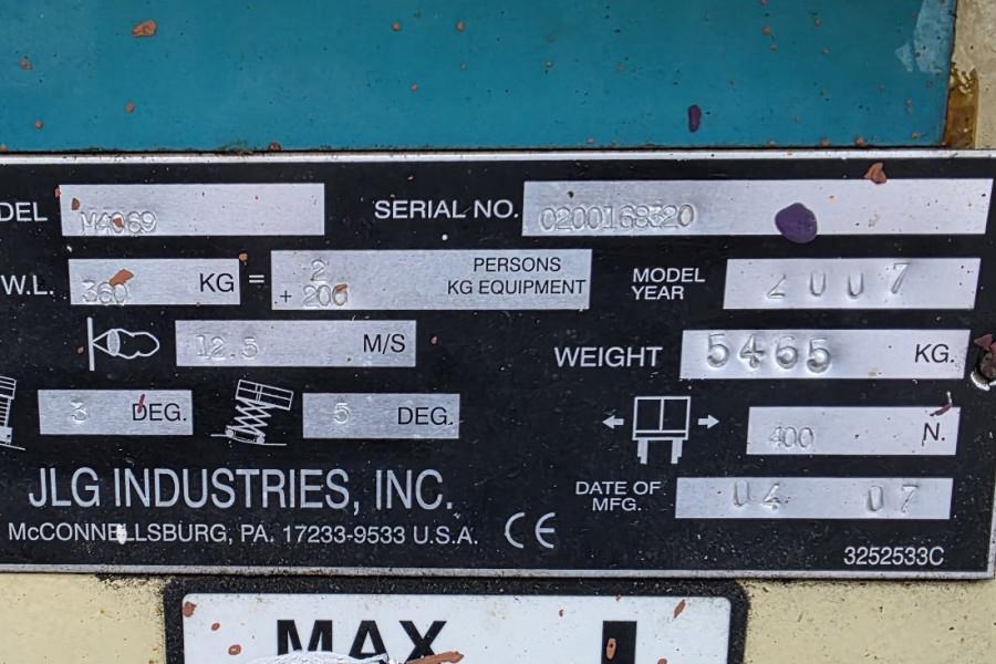 Manufacturer: JLG Typ: M4069 Manuf Year: 2007 Fuel: Hybrid (Electric / Diesel) Serial number: 0200168320 Working hours: 820 h Working height: 14.19 Loading / lifting capacity: 360 kg Capacity on Deck Extension: 120 kg Drive speed: 4.8 km/h Maximum Drive Height: 9.14 m Number of axles: 2 Drive / Steering: 4x2 Tyre manufacture / size: Outrigger / 240/55D17.5 Tyre condition: 70 % NON MARKING Drive Speed – Lowered: 4.8 km/h Gradeability: 35% Turning Radius – Inside: 2.29 m Turning Radius – Outside: 4.88 m * CE (Declaration of Conformity). More detailed pictures / product movie on our website. pfeifermachinery.com Above specifications are subject to change without prior notice and subject to errors