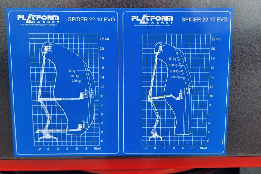 This machine can be sold with warranty. Inform about our conditions! Manufacturer: Platform Basket Typ: Spider 22.10 EVO Year: 2026 Fuel: Diesel / Electric Engine 230V Serial number: PB15569 Working Height: 21.70 m Maximun side outreach: 10.30 m Rotation angle of the tower: 365 Maximum capacity of basket: 230 kg Aluminium basket dimensions: 1.50 x 0.70 m Basket rotation angle: 90+90 ° Maximum horizontal inclination: 16° (29%) Maximum side inclination: 17° (31%) Air/water and 230Vac outlets are available into the basket Quick detach and interchangeable cage Length closed (basket disassembled): 5.28 m * CE (Declaration of Conformity) More detailed pictures / product movie on our website. pfeifermachinery.com Above specifications are subject to change without prior notice and subject to errors.