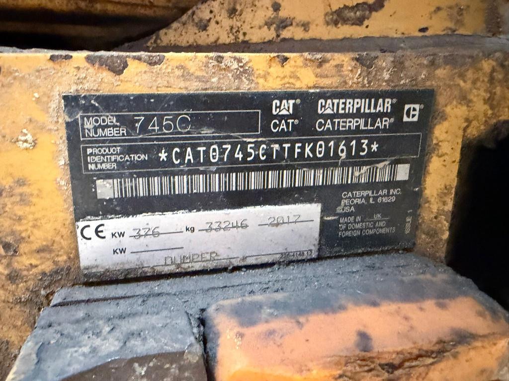 Used Caterpillar 745C Articulated Dump Truck – 2017 – For Sale at BIG Machinery This Caterpillar 745C articulated dump truck, built in 2017 and made in the United Kingdom, is now available for sale at BIG Machinery in the Netherlands. Powered by a Caterpillar C18 engine delivering 376 kW, this machine is designed for high-performance hauling in quarry, mining, and large earthmoving applications. With 16,057 operating hours, 6x6 axle configuration, and Stage 4 emissions, it offers reliability and efficiency on demanding jobsites. Fitted with tyres showing approximately 40% remaining, this unit is ready for continued operation. The machine is CE certified and suitable for international use. - Year: 2017 - Made in: United Kingdom - Hours: 16,057 - Engine: Caterpillar C18 - Power: 376 kW - Emissions: Stage 4 - Axle configuration: 6x6 - Tyres: ±40% - Certification: CE certified - Condition: Used Interested in this Caterpillar 745C? Contact BIG Machinery for more information, inspection details or a quotation. We deliver worldwide and can arrange complete export documentation and transport from our headquarters in the Netherlands. Why Choose BIG Machinery? At BIG Machinery, you benefit from over 30 years of experience in the trade of new and used machines. With our headquarters in the Netherlands, a dedicated and cohesive team, and extensive expertise in sea transport, we ensure reliable and fast delivery worldwide. We offer competitive market prices, carefully selected machine quality, and the assurance of a long-term partnership. With our own transport services, we provide seamless and efficient support from start to finish. Choose BIG Machinery as your trusted partner and discover why we are the preferred choice for customers worldwide. Quality, speed, and reliability – Buy BIG! = More information = Tyre profile: 40% Drive: Wheel Empty weight: 33.246 kg Emissions / Stage: stage IV
