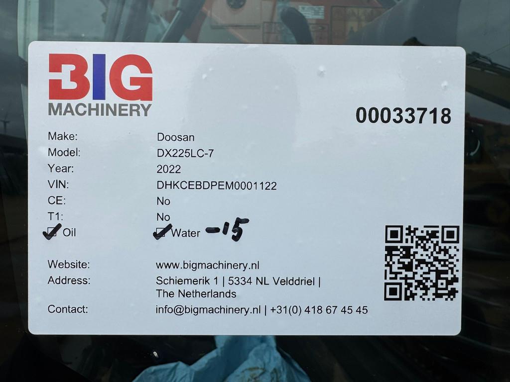 Used Doosan DX225LC-7 Crawler Excavator – 2022 | For Sale at BIG Machinery This Doosan DX225LC-7 Crawler Excavator is now available for sale at BIG Machinery in the Netherlands. Manufactured in 2022, this machine has 5,867 operating hours and a total operating weight of 22.3 tons. It is powered by a Stage V Doosan DL06V engine delivering 141 kW and 82 kgf·m torque, using AdBlue and featuring a 400 L fuel tank. Equipped with auxiliary hydraulics, hydraulic quick coupler, boom & stick check valves, and 800 mm triple-grouser tracks, this excavator offers outstanding performance and versatility on any job site. The ROPS cabin is fitted with air conditioning, an 8" Doosan Smart Touch display, Smart Key, Bluetooth connectivity, and an optional 360° surround-view camera system for enhanced comfort and safety. - Condition: Used - Year: 2022 - Engine model: Doosan DL06V - Engine power: 141 kW - Torque: 82 kgf·m - Emission stage: Stage V - AdBlue system - Operating hours: 5,867 - Operating weight: 22,300 kg - Fuel tank capacity: 400 L - Stick length: 2,900 mm - Auxiliary hydraulics - Boom & stick check valves - Hydraulic quick coupler - Tracks: 800 mm triple-grouser - ROPS cabin with A/C - Doosan Smart Touch display (8") - Smart Key + Bluetooth - 360° camera system (optional) Interested in this Doosan DX225LC-7 Excavator? Contact BIG Machinery for more information, inspection details, or a quotation. We deliver worldwide and can arrange complete export documentation and transport from our headquarters in the Netherlands. Why Choose BIG Machinery? At BIG Machinery, you benefit from over 30 years of experience in the trade of new and used machines. We offer competitive prices, carefully selected machine quality, and fast worldwide delivery. Quality, speed, and reliability – Buy BIG! = More information = Empty weight: 26.300 kg