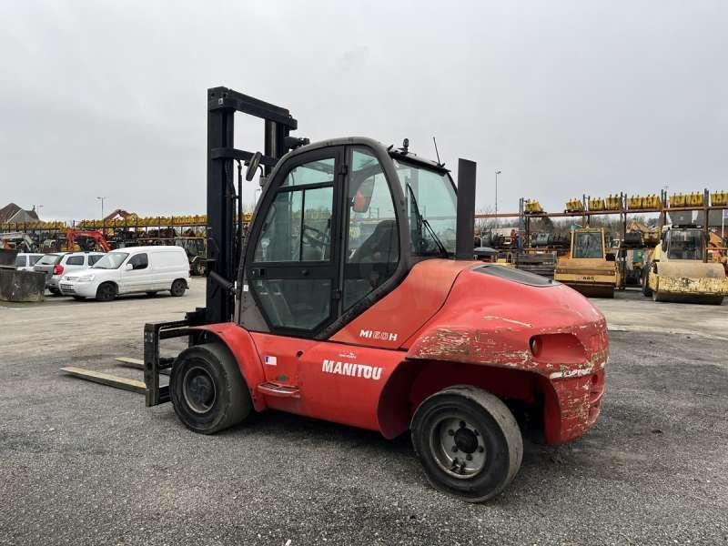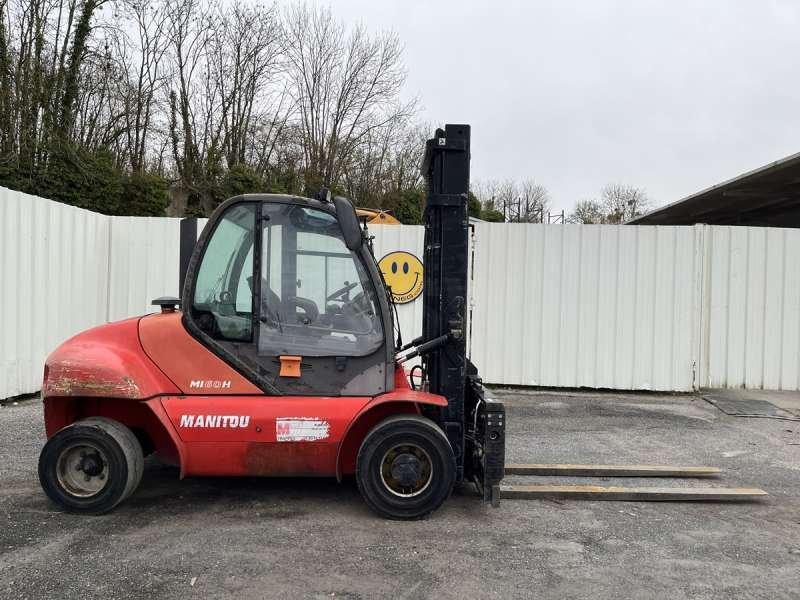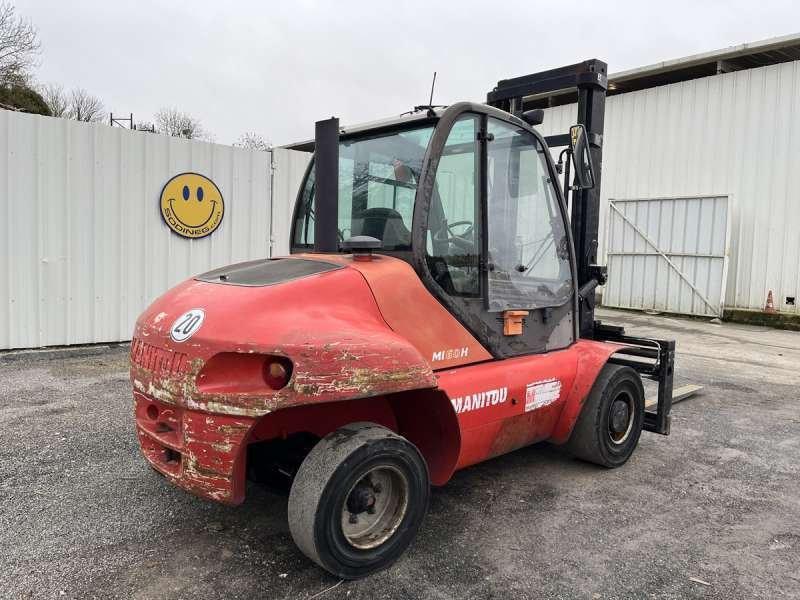 Ce chariot télescopique de la marque Manitou est le modèle MI60H de 2010. Longueur : 5 M 80 Largeur : 1 M 95 Hauteur : 3 M Poids : 8909 kilos Taille pneus à l'arrière : 355/65-15 Taille pneus à l'avant : 8.25 -15 Capacité charge nominale : 6 T Hauteur de levée maximale : 4 M Longueur Fourche : 2 M 20 Levage avec / sans charge : 0.8/0.44 m/s Vitesse avec / sans charge : 25 km/h Descente avec charge : 0.5 m/s Moteur Perkins 1104C-44T de 74.5 kW (101 ch) 6.270 Heures