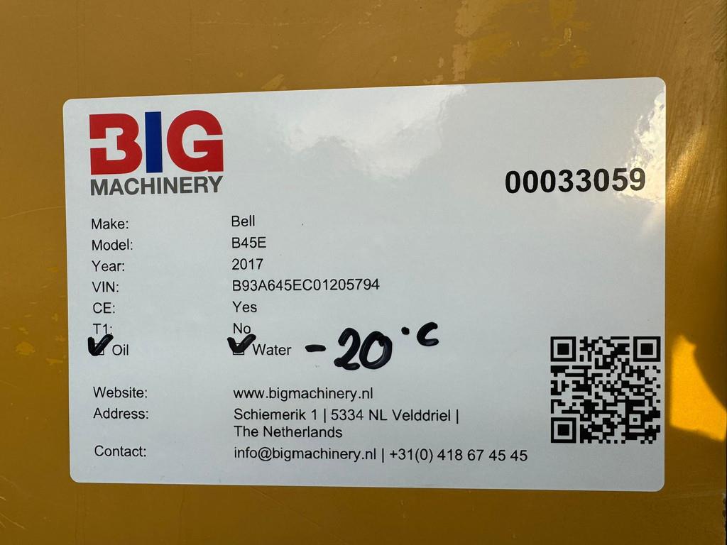 2017 Bell B45E Dump truck for sale. The Bell B45E is used in Germany by one single owner. CE certified Introducing the Bell B45E, the ultimate solution for heavy-duty transport in construction, mining, and infrastructure projects. This articulated dump truck combines unmatched performance with user-friendly features, designed to tackle the most demanding work environments. Key Features: Engine and Performance: Mercedes-Benz OM471LA: 390 kW (523 hp) of raw power at 1700 rpm. Outstanding torque performance with 2460 Nm at 1300 rpm. Environmentally friendly, meeting EU Stage IIIA / EPA Tier 3 emission standards. Advanced Drivetrain: Allison 4700 ORS Transmission: Fully automatic gearbox with 7 forward and 1 reverse gear. Hydrodynamic torque converter with lock-up in all gears. Rugged Build: Advanced hydraulic system with a maximum pressure of 315 bar. Powerful dual hydraulic cylinders for quick dump cycles: 11 seconds up, 6 seconds down. Maximum tipping angle of 70 degrees, programmable for specific tasks. Capacity and Efficiency: Payload: Up to 41,000 kg. Dump body with a capacity of 25 m³ (SAE 2:1), expandable to 26 m³ with an optional tailgate. Comfort and Safety: ROPS/FOPS-certified cab with a low noise level of 76 dBA. Deluxe interior with a 10-inch LCD screen for all vehicle statistics. Optional Comfort Ride suspension and air conditioning for long workdays. Why Choose the Bell B45E? Lower operating costs thanks to efficient fuel consumption and maintenance-friendly components. Advanced traction control and automatic braking systems for maximum safety and performance. Ideal for various terrains, from sand to heavy clay. Are you ready to elevate your productivity to the next level? Contact us for more information or a test drive! = More information = Drive: Wheel Tyre manufacture / size: 29.5R25