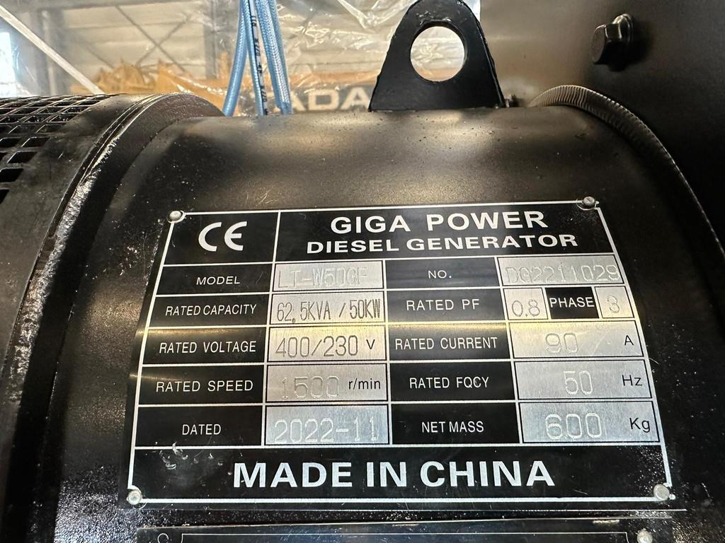 Brand: GIGA POWER Unit power: 62.5KVA Model: LT-W50GF Power: 50KW Rated power factor: cOSφ = 0.8 (hysteresis) Rated output voltage: 400V/230V Rated current: 90A Rated frequency: 50Hz Rated speed: 1500rpm Engine Brand: Weifang Power Color: gray, white, blue Model: ZH4105ZD Diesel engine (main/standby) power: 55kW Number of cylinders: 4 Generator brand: Shanghai Duning Lead-acid battery: 60A/2