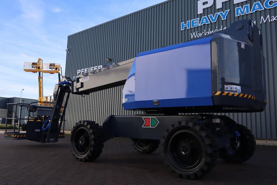 Self-Propelled Boomlift Aichi SP14D1JM YEAR 2022 This machine has a valid inspection and can be sold with warranty. Inform about our conditions! This machine is also available for rent! Manufacturer: Aichi Typ: SP14D1JM Building year: 2022 Fuel: Diesel Serial number: 812450 Working Height 15.9 m Horizontal Outreach: 12.6 m Lift Capacity: 270 kg (2 persons) Platform Size: 1.80 x 0.90 m Platform rotation 180° Turntable rotation 360° continuous Drive speed 1.2 - 7.2 km/h Tilt 5° Gradeability 47 % (25°) Tyres: 33x12-20 Solid Engine: Yanmar 4TNV88-KASV LxWxH 7.75 x 2.30 x 2.45 m CE (Declaration of Conformity) More detailed pictures / product movie on our website. pfeifermachinery.com Above specifications are subject to change without prior notice and subject to errors.