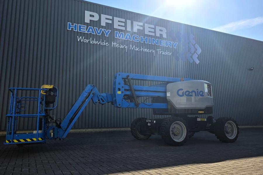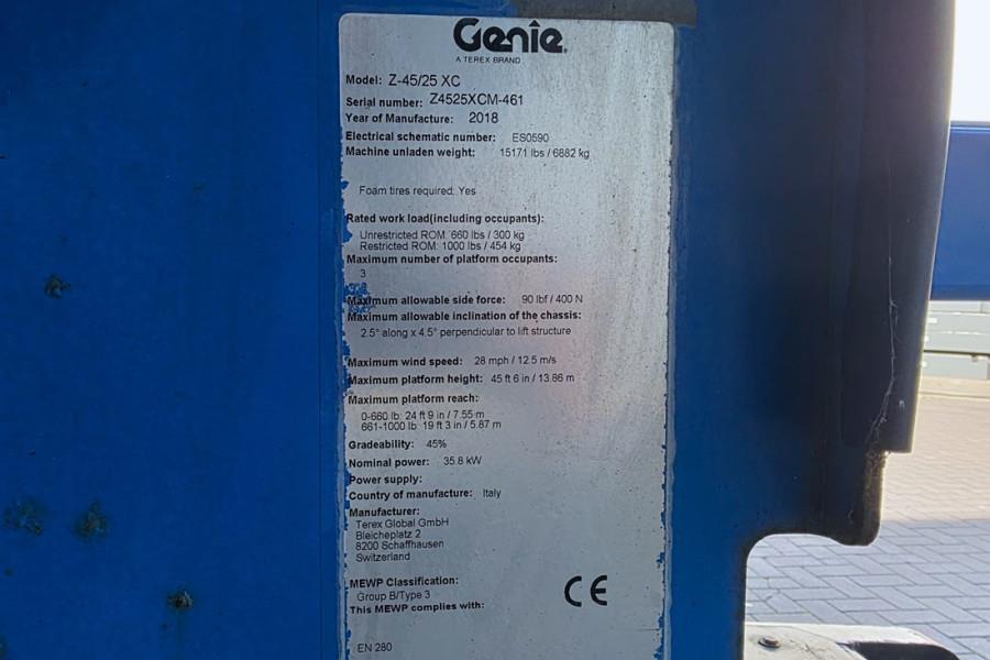 Self-Propelled Articulating Boomlift GENIE Z-45XC YEAR 2018 Manufacturer: Genie Typ: Z45/25XC Mnuf. year: 2018 Fuel: Diesel Serial number: Z4525XCM-461 Working Hours: 1.801 h Engine: D 2011 L 03 I Engine Output: 36.3 kW - 49 HP - 2800 RPM On Board Generator Working height maximum: 15.86 m Platform height maximum: 13.86 m Horizontal reach maximum: 7.55 m Up and over clearance maximum: 7.22 m Platform Capacity Restricted: 454 kg Platform Capacity Unrestricted: 300 kg Platform rotation: 160° Vertical Jib rotation: 135° Turntable rotation: 355° non-continuous Turntable tailswing: zero Drive speed - stowed: 7.24 km/h Drive speed - raised: 0.98 km/h Gradeability - 4WD - stowed*** 45% Tires: Outrigger / 315/55 D20 (70%) 4x4 Drive and 2-Wheel Steering CE (Declaration of Conformity) More detailed pictures / product movie on our website. pfeifermachinery.com Above specifications are subject to change without prior notice and subject to errors.