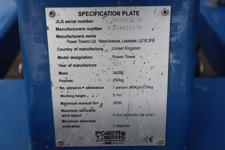 Manufacturer: JLG. Typ: Power Tower Building year: 2017 Fuel: Electric Serial number: 34102117A Maximum Working Height: 5.10 m Safe working load: 250 kg Machine Weight: 342kg Platform dimensions: 1.52 m x 0.75 m Working foot print: 1.60 m x 0.78 m Easy access gate Compact - only 0.78 m wide, passes easily through standard doorways CE (Declaration of Conformity). More detailed pictures / product movie on our website. pfeifermachinery.com Above specifications are subject to change without prior notice and subject to errors