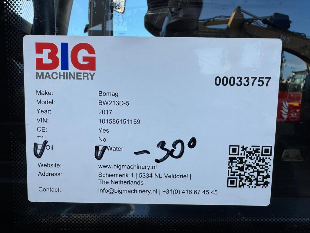 Used Bomag BW213D-5 Roller – CE Certified | For Sale at BIG Machinery This Bomag BW213D-5 Roller is made in Germany and now available for sale at BIG Machinery in the Netherlands. The machine is from 2017 and has 4,970 operating hours. It is powered by a TCD3.6 L4 engine with 95 kW. - Condition: Used, well-maintained - CE Certified - Engine: TCD3.6 L4, 95 kW Interested in this Bomag BW213D-5? Contact BIG Machinery for more information, inspection details, or a quotation. We deliver worldwide and can arrange complete export documentation and transport from our headquarters in the Netherlands. At BIG Machinery, you benefit from over 30 years of experience in the trade of new and used machines. With our headquarters in the Netherlands, a dedicated and cohesive team, and extensive expertise in sea transport, we ensure reliable and fast delivery worldwide. We stand out with our competitive market prices, carefully selected machine quality, and the assurance of a long-term partnership. With our own transport services, we provide seamless and efficient service from start to finish. Choose BIG Machinery as your trusted partner and discover why we are the preferred choice for customers worldwide. Quality, speed, and reliability – Buy BIG! = More information = Drive: Wheel Empty weight: 12.510 kg