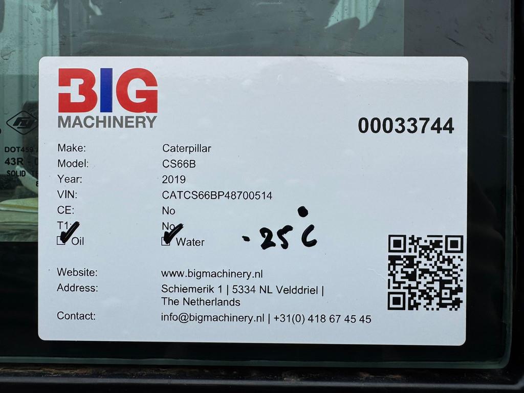 Used Caterpillar CS66B Drum Roller – 2019 | For Sale at BIG Machinery This Caterpillar CS66B Drum Roller is now available for sale at BIG Machinery in the Netherlands. The machine was manufactured in 2019 and has 4,105 operating hours. It is powered by a CAT C4.4 engine delivering 117 kW, compliant with EU Stage IV emissions and equipped with AdBlue. With a total weight of 12,362 kg and drum drive, this roller provides excellent performance and reliability for compaction work. - Condition: Used - Year: 2019 - Engine model: CAT C4.4 - Engine power: 117 kW - Emission stage: EU Stage IV - AdBlue system - Operating hours: 4,105 - Operating weight: 12,362 kg - Drum drive - Fuel type: Diesel Interested in this Caterpillar CS66B Drum Roller? Contact BIG Machinery for more information, inspection details, or a quotation. We deliver worldwide and can arrange complete export documentation and transport from our headquarters in the Netherlands. Why Choose BIG Machinery? At BIG Machinery, you benefit from over 30 years of experience in the trade of new and used machines. We offer competitive prices, carefully selected machine quality, and fast worldwide delivery. Quality, speed, and reliability – Buy BIG! = More information = AdBlue system: Yes Drive: Wheel Empty weight: 12.362 kg Emissions / Stage: 4
