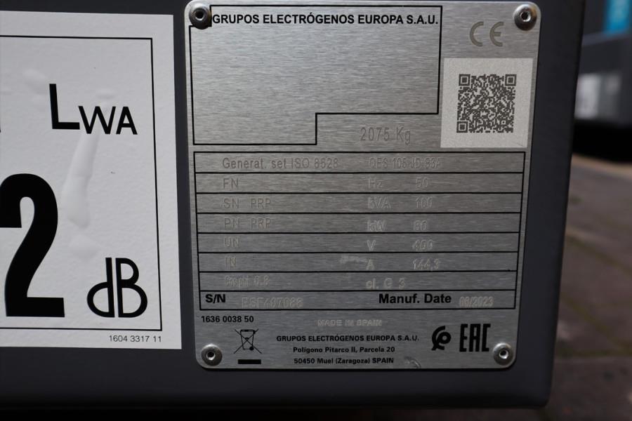 Pfeifer Rentals & Sales B.V is an official Atlas Copco dealer. This machine has a valid inspection and can be sold with warranty. Inform about our conditions! Manufacturer: Atlas Copco Typ: QES 105 JD S3A ESF Building year: 2023 Fuel: Diesel Serial nr: ESF407088 Engine brand: JOHN DEERE Model: 4045HFG82 R.P.M.:1.500 Fuel Diesel No. of cylinders 4 L Engine Capacity (c.c.) 4.500 ALTERNATOR Brand: MECC ALTE Model: ECP34-2S/4A Alternator Power (kVA) 105 / Continuous (H) Number of wires :12 IP Alternator: IP 23 CE (Declaration of Conformity). More detailed pictures / product movie on our website. pfeifermachinery.com Above specifications are subject to change without prior notice and subject to errors.