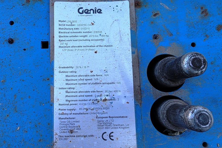 Manufacturer: Genie Typ: GS2632 Building year: 2015 Fuel: Electric Serial number: GS3215C-14257 Working hours: 285 h * Working Height: 10 m * Platform extension: 0.91m. * Drive: 2 wheel drive and steer (front) * Non Marking Tyres CE (Declaration of Conformity). More detailed pictures / product movie on our website. pfeifermachinery.com Above specifications are subject to change without prior notice and subject to errors.