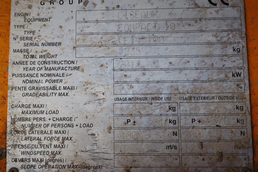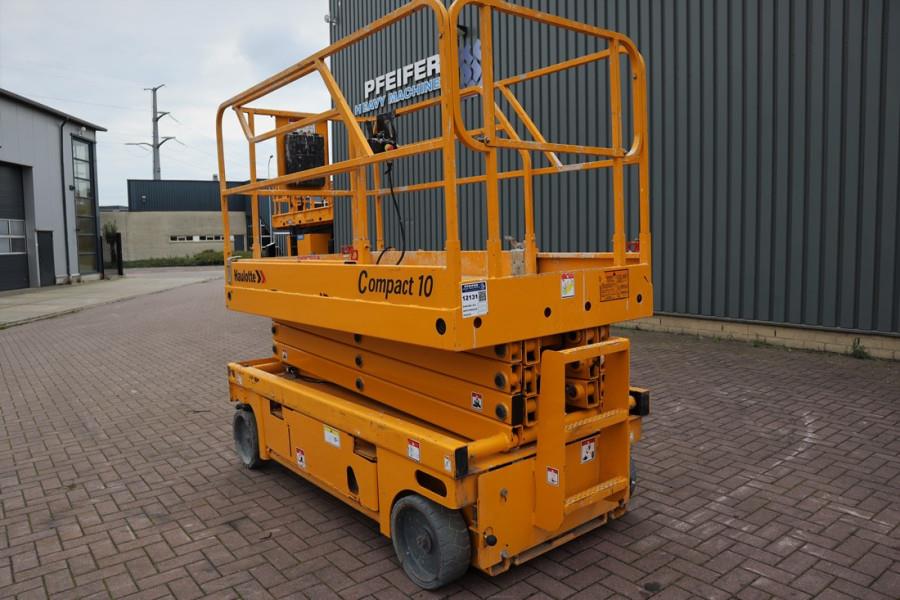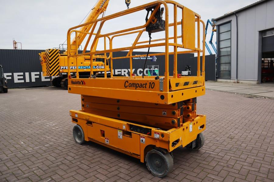 Manufacturer: Haulotte .. Typ: Compact 10 Building year: 2011 Fuel: Electric Serial number: CE145100 Hours: 718 h Working height: 10.2 m Loading / lifting capacity: 450 kg Drive speed: 4 km/h Tyre manuf. / size: Haulotte 15x5 Non Marking Tyres: 20% Gearbox typ: Hydrostatic Capacity in KW: 3 Capacity in HP: 4 CE (Declaration of Conformity). More detailed pictures / product movie on our website. pfeifermachinery.com Above specifications are subject to change without prior notice and subject to errors.