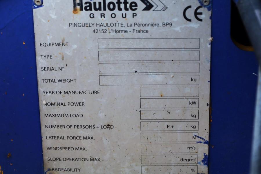 Manufacturer: Haulotte Typ: H15SX Building year: 2007 Fuel: Diesel Serial number: CD113585 Working Hours: 2.547 h Loading / lifting capacity: 500 kg Working height: 15 m Drive speed: 1.6 - 6 km/h. Number of axles: 2 Drive / Steering: 4x4 Tire Condition: 3 x 40% - 1 x 10% Gearbox typ: Hydrostatic Engine manufacture / typ: Hatz / 2L41C Capacity in KW: 23,1 Capacity in HP: 31 * Extended platform length: 7,30 m. * Number of extensions: 2 x 1 m. * Turning radius - outside: 4.96 m. * Gradeability: 40%. CE (Declaration of Conformity) More detailed pictures / product movie on our website. pfeifermachinery.com Above specifications are subject to change without prior notice and subject to errors