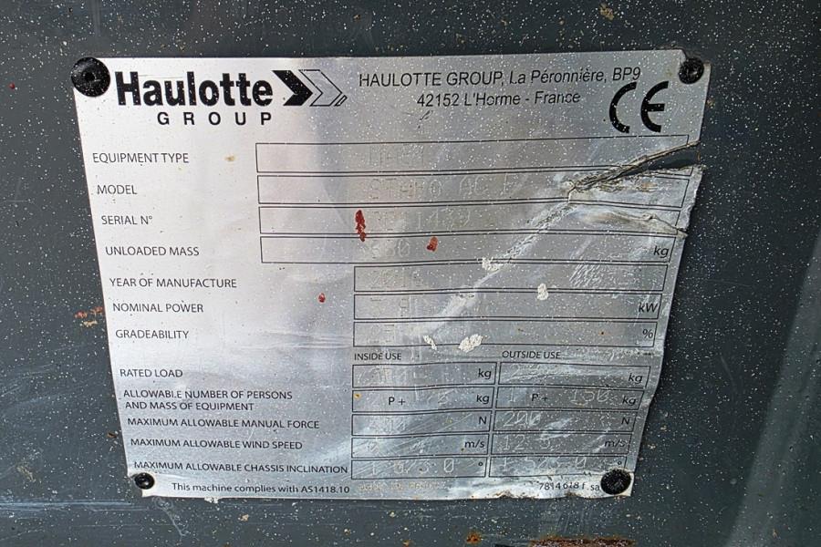 Self-Propelled Vertical Lift Haulotte Star 6AC E Year 2016. Manufacturer: Haulotte Typ: Star 6AC E Building year: 2016 Fuel: Electric, Serial number: 2011439 Working Hours: 383 h Working height: 5.8 m Max driveable platf. height: 3.8 m Lift capacity - inside 230 kg (2 pers.) Lift capacity - outside 230 kg (1 pers.) Platform size with extension: 0.77 x 1.30 + 0.4 m Drive speed proportional 0.8 - 4.5 km/h Tyres - non marking: 318 x 108 Turning radius - outside 1.7 m Tilt alarm: 1.5° / 3° Wheelbase: 1.06 m Ground clearance: 6 cm CE (Declaration of Conformity)