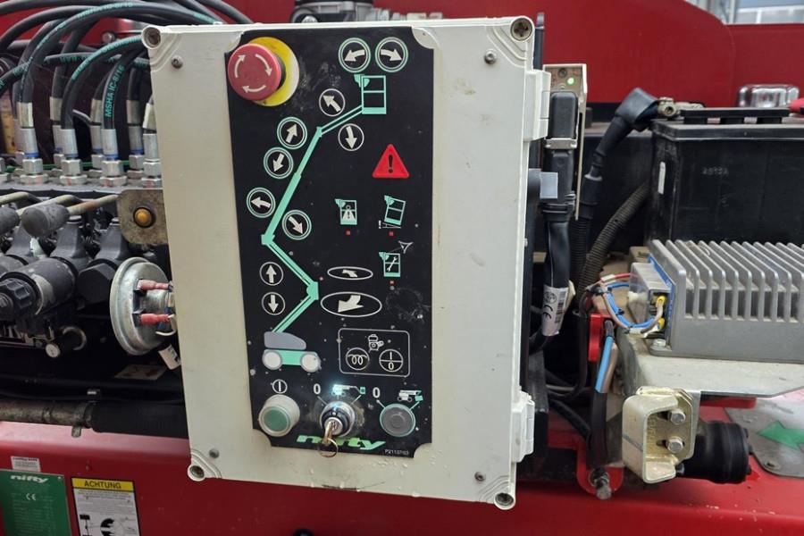 Manufacturer: Nifty lift Typ: HR17 Hybrid 4WD Mnuf. year: 2013 Fuel: Hybrid Serial number: 08 26447 Working Hours: 316 h Height - Working: 17.2m Outreach - Working: 9.4m Platform Capacity: 225kg Slew: 360° Flyboom Arc: 150° Turning Radius: 3.7 m Platform Rotation: 180° Cage Size: 1.80m x 0.85m Drive Speed: 0 - 5km/h Gradeability: 45% Tyres: Solideal / 33x12-20 Tyre Condition: 90% Engine: Kubota D722 Transport size LXWXH: 4.8 x 2.00 x 2.10 m CE (Declaration of Conformity) More detailed pictures / product movie on our website. pfeifermachinery.com Above specifications are subject to change without prior notice and subject to errors.