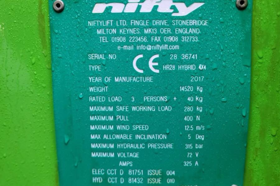Some machines have a minor defect or malfunction upon arrival. Due to a lack of capacity, these are not immediately prepared for presentation, but are often perfectly suitable for customers with technical knowledge or their own workshop. That''s why we offer a separate category: As-Is Machines. These machines are sold in their current condition – without warranty, but at a very attractive price. Advantages: Immediately available and can be viewed in Groenlo Fully transparent presentation with photos and inspection options Ideal for repairs, parts, or in-house overhaul Particularly attractive price-wise This Niftylift powers on, but the engine does not start and displays multiple fault codes. It only operates when power is supplied directly to the emergency pump. The battery pack is weak or defective. Manufacturer: Niftylift Typ: HR28 HYBRID 4WD Mnuf. year: 2017 Fuel: Hybrid - Battery & Diesel Serial number: 28 36741 Working Height: 28 m Horizontal reach: 19 m Loading / lifting capacity: 280 kg Slew: 360° Continuous. Fly-Boom Arc: 150°. Platform Rotation: 180°. Platform Size: 2.4m x 0.9m Turning Radius-Outside: 5.9 m Gradeability: 40% (22°) Tyres: Non marking: 80% Engine: (Kubota - 47.5Hp / 35kW) Travel Speed: 4.7 km/h SAFETY FEATURES * SiOPS® * Tilt Alarm * Foam Filled Tyres * Harness Points * CE Mark * Lock Valves on all Hydraulic Cylinders * Automatic Fail-Safe Brakes * Powered Auxiliary Descent * Dual Controls (Platform & Base) Transport size LXWXH: 7.30m x 2.49m x 2.70m CE (Declaration of Conformity) More detailed pictures / product movie on our website. pfeifermachinery.com Above specifications are subject to change without prior notice and subject to errors
