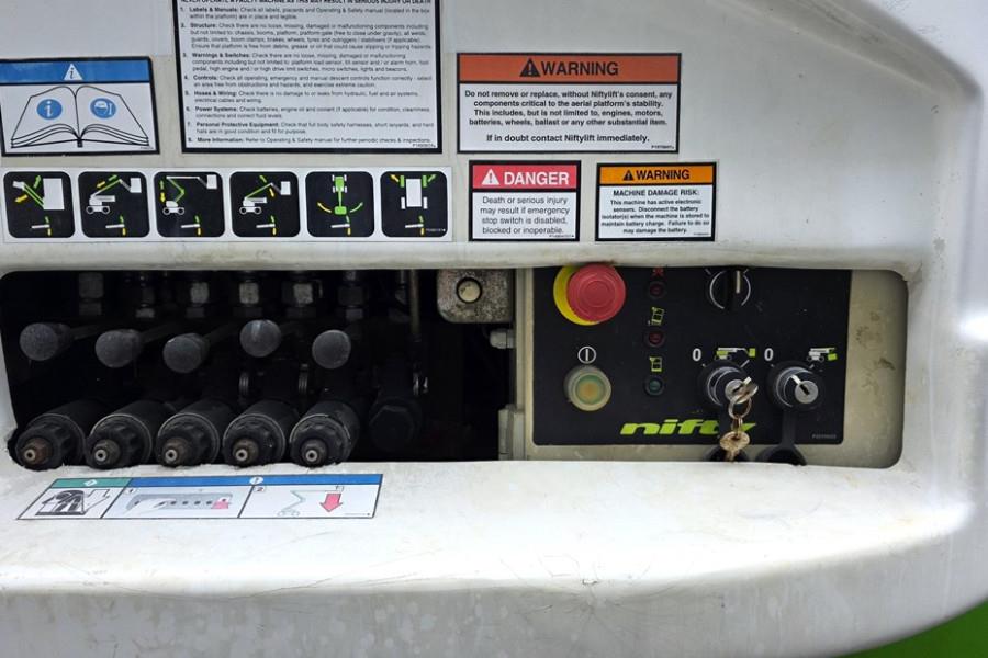 Manufacturer: Niftylift Typ: HR28 HYBRID Mnuf. year: 2014 Fuel: Hybrid - Battery & Diesel Serial number: 28-24516 Working Height: 28 m Horizontal reach: 19 m Loading / lifting capacity: 280 kg Slew: 360° Continuous. Fly-Boom Arc: 150°. Platform Rotation: 180°. Turning Radius-Outside: 5.9 m Platform Size: 2.4m x 0.9m Gradeability: 40% (22°) Tyres: Non marking (70%) Engine: (Kubota - 47.5Hp / 35kW) Travel Speed: 4.7 km/h SAFETY FEATURES * SiOPS® * Tilt Alarm * Foam Filled Tyres * Harness Points * CE Mark * Lock Valves on all Hydraulic Cylinders * Automatic Fail-Safe Brakes * Powered Auxiliary Descent * Dual Controls (Platform & Base) Transport size LXWXH: 7.30m x 2.49m x 2.70m CE (Declaration of Conformity) More detailed pictures / product movie on our website. pfeifermachinery.com Above specifications are subject to change without prior notice and subject to errors.