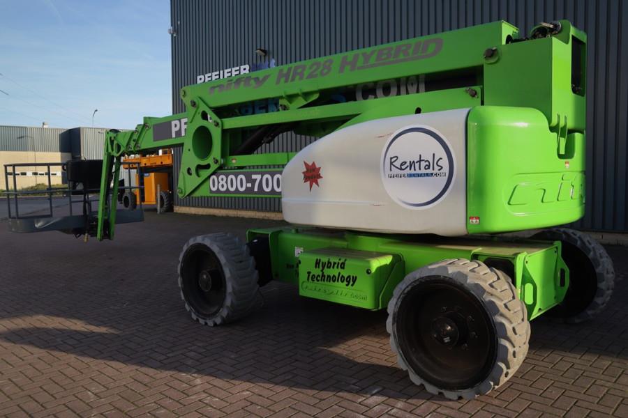 This Nifty Lift HR28 is also available for rental. Manufacturer: Niftylift Typ: HR28 HYBRID 4WD Mnuf. year: 2015 Fuel: Hybrid - Battery & Diesel Serial number: 28 27355 Working Hours Battery: 992 h Working Hours Engine: 832 h * Working Height: 28 m * Horizontal reach: 19 m * Loading / lifting capacity: 280 kg * Slew: 360° Continuous. * Fly-Boom Arc: 150°. * Platform Rotation: 180°. * Turning Radius-Outside: 5.9 m * Platform Size: 2.4m x 0.9m * Gradeability: 40% (22°) * Tyres: Non marking (70%) * Engine: (Kubota - 47.5Hp / 35kW) * Travel Speed: 4.7 km/h SAFETY FEATURES * SiOPS * Tilt Alarm * Foam Filled Tyres * Harness Points * CE Mark * Lock Valves on all Hydraulic Cylinders * Automatic Fail-Safe Brakes * Powered Auxiliary Descent * Dual Controls (Platform & Base) Transport size LXWXH: 7.30m x 2.49m x 2.70m CE (Declaration of Conformity) More detailed pictures / product movie on our website. pfeifermachinery.com Above specifications are subject to change without prior notice and subject to errors