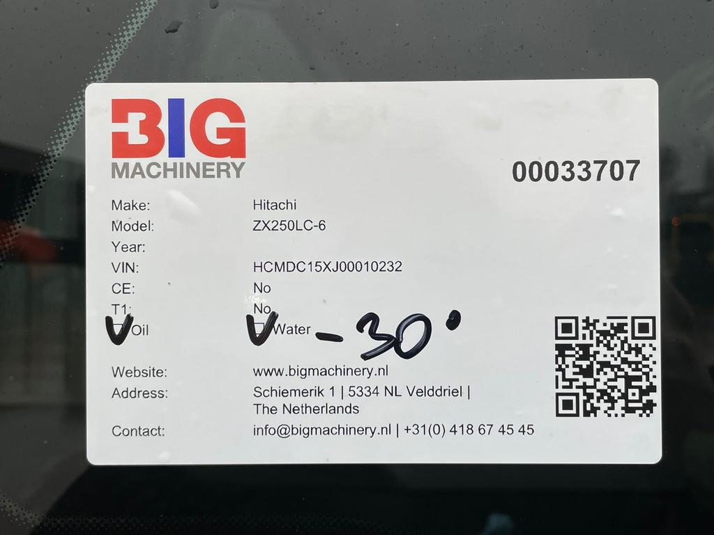Used Hitachi ZX250LC-6 Hydraulic Excavator – 2018 – For Sale at BIG Machinery. This Hitachi ZX250LC-6 hydraulic excavator is now available for sale at BIG Machinery in the Netherlands. Built in 2018 in the Netherlands, this machine has 9.800 operating hours and is in good working condition. It is equipped with an AQ-4HK1X engine delivering 140 kW, CE certification, EPA marking, hammer lines, air conditioning, a tiltrotator and a bucket. A highly versatile excavator ideal for earthmoving, construction, landscaping, infrastructure and precision excavation work. - Year: 2018 - Hours: 9.800 - Engine: AQ-4HK1X – 140 kW - Made in: Netherlands - Certification: CE - EPA marked: Yes - Hammer lines: Yes - Tiltrotator: Yes - Bucket: Yes - Air conditioning: Yes - Condition: Used Interested in this Hitachi ZX250LC-6? Contact BIG Machinery for more information, inspection details or a quotation. We deliver worldwide and can arrange complete export documentation and transport from our headquarters in the Netherlands. Why Choose BIG Machinery? At BIG Machinery, you benefit from over 30 years of experience in the trade of new and used machines. With our headquarters in the Netherlands, a dedicated and cohesive team, and extensive expertise in sea transport, we ensure reliable and fast delivery worldwide. We offer competitive market prices, carefully selected machine quality, and the assurance of a long-term partnership. With our own transport services, we provide seamless and efficient support from start to finish. Choose BIG Machinery as your trusted partner and discover why we are the preferred choice for customers worldwide. Quality, speed, and reliability – Buy BIG! = More information = Empty weight: 27.100 kg