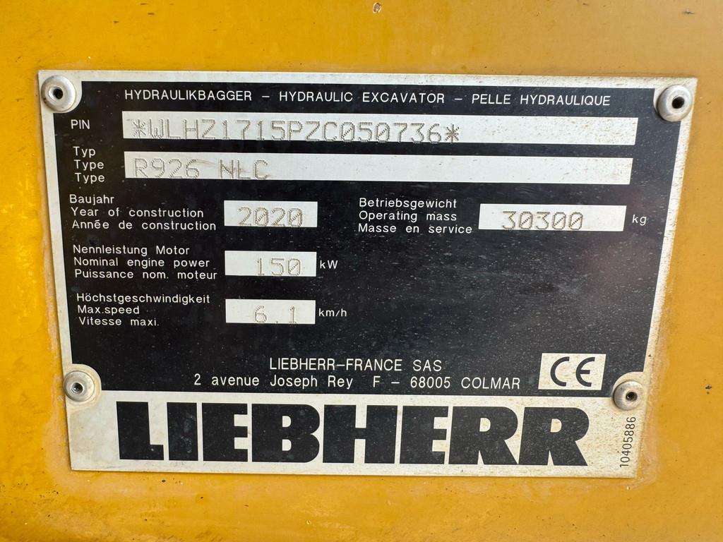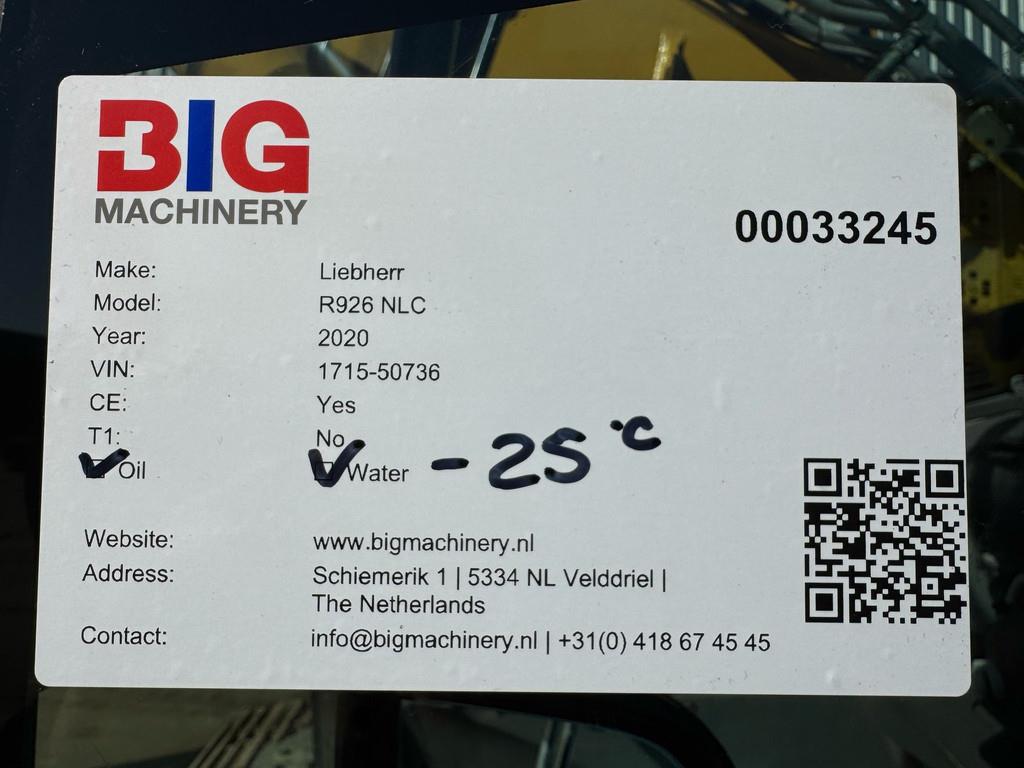 Used Liebherr R926 NLC Hydraulic Excavator – 2020 – For Sale at BIG Machinery This Liebherr R926 NLC hydraulic excavator, built in France in 2020, is available for sale at BIG Machinery in the Netherlands. The machine is CE certified and equipped with hydraulic hammer lines, a hydraulic quick coupler, and 600 mm track shoes, making it ideal for construction, earthmoving, and general excavation tasks. The air-conditioned cabin ensures operator comfort, and a bucket can be supplied upon request. • Year: 2020 • Condition: Used • Country of manufacture: France • Certification: CE certified • Operating hours: 7,662 • Cabin: Air-conditioned • Hydraulic system: Hammer lines • Quick coupler: Hydraulic • Track shoes: 600 mm • Bucket: On request Interested in this Liebherr R926 NLC? Contact BIG Machinery for more information, inspection details, or a quotation. We deliver worldwide and can arrange complete export documentation and transport from our headquarters in the Netherlands. Why Choose BIG Machinery? At BIG Machinery, you benefit from over 30 years of experience in the trade of new and used machines. With our headquarters in the Netherlands, a dedicated and cohesive team, and extensive expertise in sea transport, we ensure reliable and fast delivery worldwide. We offer competitive market prices, carefully selected machine quality, and the assurance of a long-term partnership. With our own transport services, we provide seamless and efficient support from start to finish. Choose BIG Machinery as your trusted partner and discover why we are the preferred choice for customers worldwide. Quality, speed, and reliability – Buy BIG! = More information = Empty weight: 30.300 kg Width: 299 cm