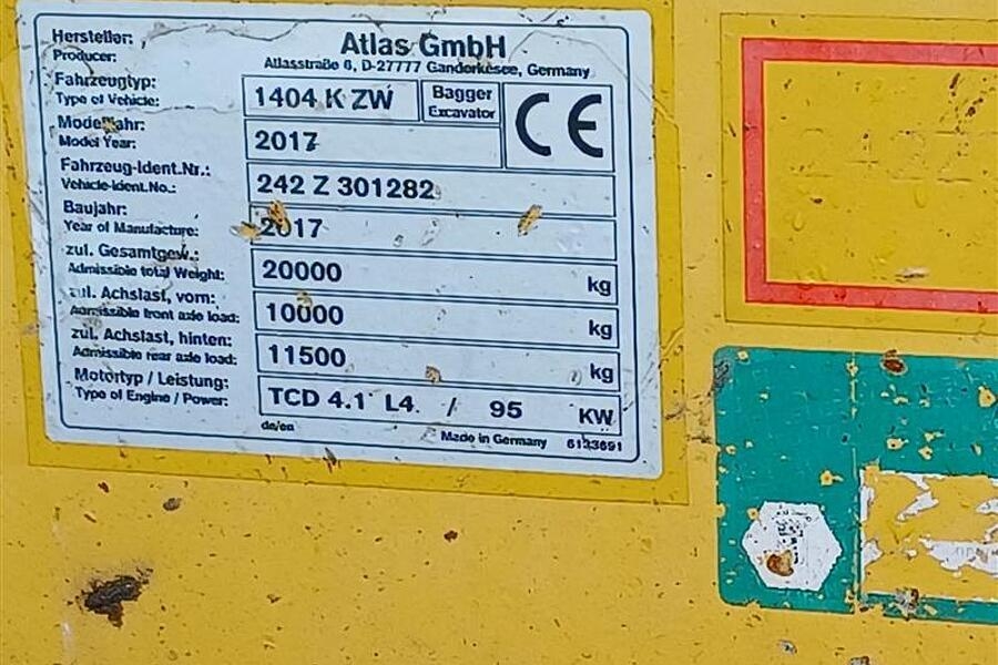 Maschinendaten Maschinenbezeichnung: Zweiwegebagger Modell: 1404 K ZW Hersteller: Atlas Baujahr: 2017 Betriebsstunden: 10629 Gewicht [to]: 20 letzter Service [h]: 25.11.24 / 10000h Motor Hersteller: Deutz Motorleistung [kW]: 95 Abgasstufe: Tier4 final (mit Ad-blue) EPA-Plakette: ok Dieselpartikelfilter vorhanden: ok Ausrüstung Grabenräumlöffel schwenkbar [cm]: 200 Greifer [cm]: 80, 28 Klimaanlage Schnellwechsler mech. Schnellwechsler [Typ]: SMP T620 Tiltrotator Specifications Model: Zweiwegebagger Type: 1404 K ZW Manufacturer: Atlas Year: 2017 Working hours: 10629 Weight [to]: 20 last service [h]: 25.11.24 / 10000h Engine Manufacturer: Deutz Engine rating [kW]: 95 Emission standard: Tier4 final (mit Ad-blue) EPA: ok exhaust gas after-treatment: ok Equipment ditch-cleaning-bucket hydr. [cm]: 200 grab [cm]: 80, 28 Air-conditioning Quick coupler mech. Quick coupler [type]: SMP T620 Tiltrotator We speak: German - English - French - Spanish - Russian - Romanian - Polish - Arabic