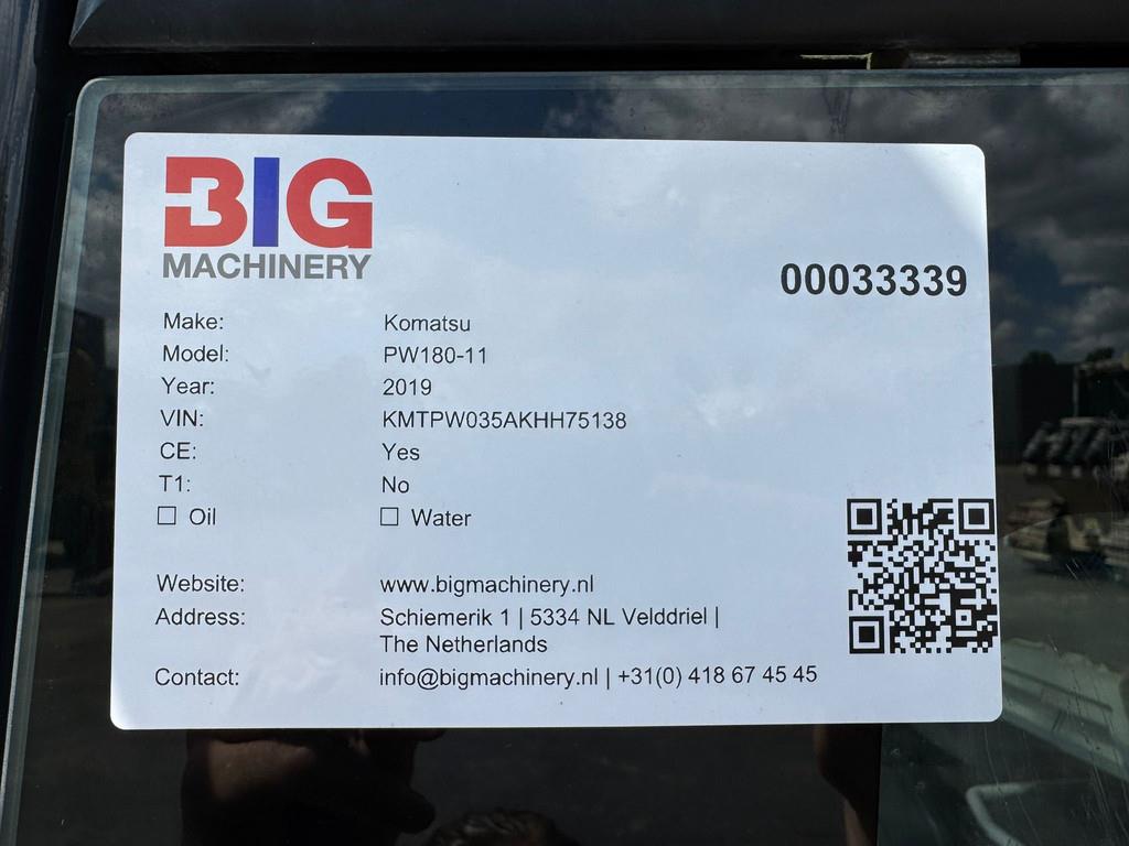 Used Komatsu PW180-11 Wheeled Excavator – 2019 – CE Certified / EPA Marked | For Sale at BIG Machinery This Komatsu PW180-11 wheeled excavator is made in Germany and now available for sale at BIG Machinery in the Netherlands. The machine is from 2019 and has 3,487 operating hours. It comes equipped with hammerlines, check valves, and is EPA marked. With a SAA6D107E-3-A Stage V engine delivering 130 kW and an operating weight of 18,800 kg, this PW180-11 is a powerful and low-emission machine suited for a wide range of urban and highway construction tasks. - Condition: Used - CE Certified / EPA Marked - Tier rate / Emissions: EU Stage V - Engine model: Komatsu SAA6D107E-3-A - Power: 130 kW - Operating weight: 18,800 kg - Operating hours: 3,487 - Hammerlines - Check valves - Machine type: Wheeled excavator (PW-series) - Year: 2019 Interested in this Komatsu PW180-11? Contact BIG Machinery for more information, inspection details or a quotation. We deliver worldwide and can arrange complete export documentation and transport from our headquarters in the Netherlands. Why Choose BIG Machinery? At BIG Machinery, you benefit from over 30 years of experience in the trade of new and used machines. With our headquarters in the Netherlands, a dedicated and cohesive team, and extensive expertise in sea transport, we ensure reliable and fast delivery worldwide. We stand out with competitive market prices, carefully selected machine quality, and the assurance of a long-term partnership. With our own transport services, we provide seamless and efficient service from start to finish. Quality, speed, and reliability – Buy BIG! = More information = Empty weight: 18.800 kg Width: 280 cm Emissions / Stage: 5 Tyre manufacture / size: 16 P.R, 146/142B