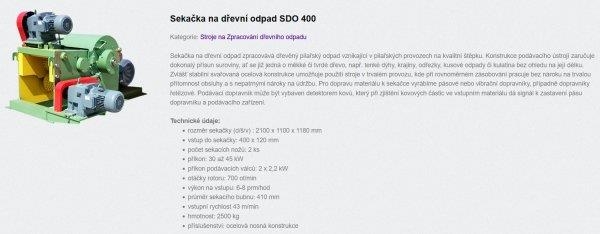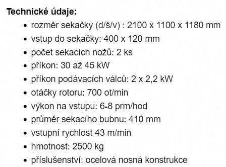 český drtič bio / štěpkovač na dřevo biomasu bez dopravníků výrobce: Strojírny Loučná model sekače dřevního odpadu: SDO 400 / 2960 GDA komplet rok výroby 2019 TECHNICKÉ ÚDAJE drtiče: rozměr (d/š/v): 2.1 x 1.1 x 1.18 m vstup 400x120 mm 2 sekací nože výkon na vstupu: 6-8 prm/h (prostorový metr rovnaný) průměr sekacího bubnu: 410 mm příkon 45 kW příkon podávacích válců: 2x 2.2 kW otáčky rotoru: 700 ot/min vstupní rychlost 43m/min hmotnost drtiče 2.5t POPIS FUNKCE: Sekačka zpracovává dřevěný pilařský odpad vznikající v provozech na štěpku. Podávací ústrojí zaručuje dokonalý přísun suroviny, ať se již jedná o měkké či tvrdé dřevo, např. tenké dýhy, krajiny, odřezky, kusové odpady či kulatina bez ohledu na její délku. Zvlášť stabilní svařovaná ocelová konstrukce umožňuje použití stroje v trvalém provozu, kde při rovnoměrném zásobování pracuje bez nároku na trvalou přítomnost obsluhy a s nepatrnými nároky na údržbu. Pro dopravu materiálu/dřeva slouží podávací dopravník. Pro výnos štěpky/biomasy slouží výsypka. ---------- TÉŽ MOŽNO jiné: -starší katr linku/rámové pily na stavební řezivo hranoly fošny. (CZ) G710+G560 za 150/185 tis -drtič/štěpkovač za 450 tis -rozmítačka, dopravníky, - vše z 1992 +kompresory z roku 2006. produkce kulatiny dle sortimentu: ca 40-50 m3/den * ca 800 m3/měsíc netto ceny/+DPH okres Plzeň-jih ID 1433315154_J+S Volejte +420 608 244 780 od Po-Pá / 9-17 h, nebo pište. Máte zájem o tento předmět ? Kontaktujte nás a rádi si s Vámi o tom pohovoříme. Možno i financování - na dotaz. #drtic #biodrtic #stepkovac #biomasa #biomasse #brecher #drevoprovoz #zpracovanidreva #drevostavby #fosny #kulatina #drevo #ramovapila #katr #katry #rozmitacka #pila #omitacka #rozmitacipila #omitacipila #multiripsaw #wood #saw #holz #forestry #drewo #drewno #sage #linkanadrevo #drevoporstavbu #vyrobanabytku #rezivo #czechmat #bazarbagru #pouzitatechnika #usedmachinery #gebrauchtemaschinen #bazarstrojuteplice #maszynybudowlane