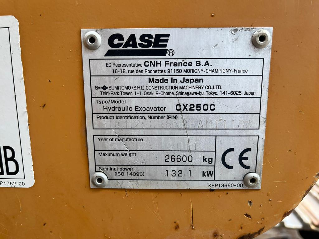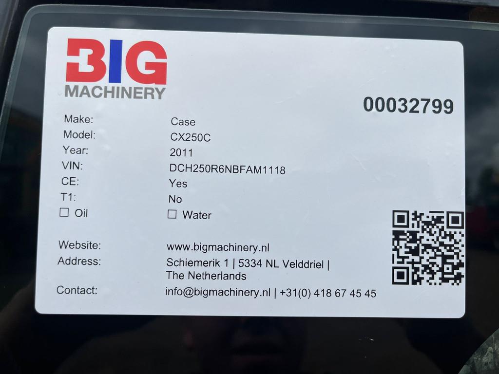 Used Case CX250C Hydraulic Excavator – 2011 – For Sale at BIG Machinery This Case CX250C hydraulic excavator, built in 2011, is available for sale at BIG Machinery in the Netherlands. The machine is CE certified, EPA marked, and equipped with hydraulic hammer and rotating lines, making it suitable for construction, earthmoving, and general excavation applications. It features a Verachtert CW40 quick coupler, check valves, and a 3,000 mm stick, providing versatility and efficiency on the job site. The excavator is supplied with a 1,250 mm cleaning bucket and runs on 600 mm track shoes. • Year: 2011 • Condition: Used • Certification: CE certified • EPA compliance: EPA marked • Operating hours: 8,125 • Hydraulic system: Hammer lines / rotating lines, check valves • Quick coupler: Verachtert CW40 • Stick length: 3,000 mm • Track shoes: 600 mm • Bucket: 1,250 mm cleaning bucket Interested in this Case CX250C? Contact BIG Machinery for more information, inspection details, or a quotation. We deliver worldwide and can arrange complete export documentation and transport from our headquarters in the Netherlands. Why Choose BIG Machinery? At BIG Machinery, you benefit from over 30 years of experience in the trade of new and used machines. With our headquarters in the Netherlands, a dedicated and cohesive team, and extensive expertise in sea transport, we ensure reliable and fast delivery worldwide. We offer competitive market prices, carefully selected machine quality, and the assurance of a long-term partnership. With our own transport services, we provide seamless and efficient support from start to finish. Choose BIG Machinery as your trusted partner and discover why we are the preferred choice for customers worldwide. Quality, speed, and reliability – Buy BIG! = More information = Empty weight: 26.600 kg Width: 300 cm