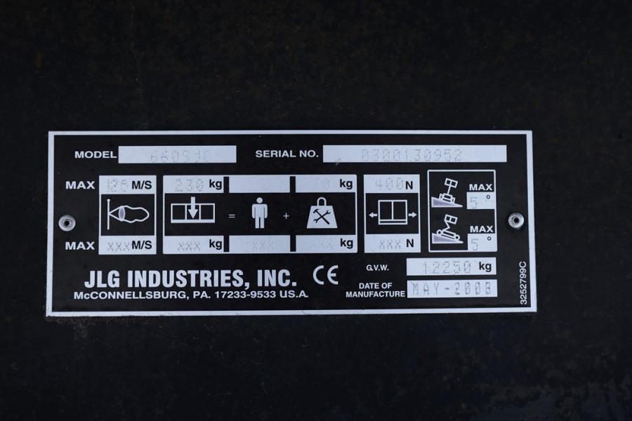 Manufacturer: JLG Typ: 600SJC Building year: 2008 Fuel: Diesel Serial number: 0300130952 Working hours: 1.974 h Working Height 20 m Working Outreach 17.4 m Swing 360° continuous Platform Capacity – Unrestricted 230 kg Platform Rotator (Hydraulic) 180° Jib - Range of articulation: 132° - +71 - 61 Drive Speed: 2.6 km/h Gradeability: 55% Turning Radius: Zero Type of Tracks: Steel Tracks Width: 0.5 m Engine: Deutz Typ: D2011 L 04 Power: 46kW - 62HP CE (Declaration of Conformity) More detailed pictures / product movie on our website. pfeifermachinery.com Above specifications are subject to change without prior notice and subject to errors