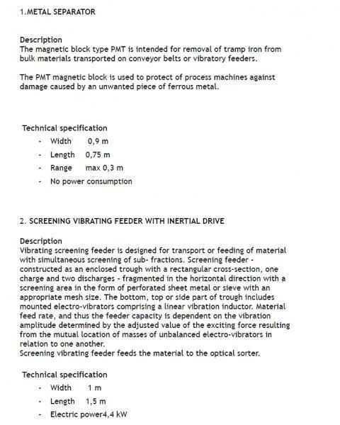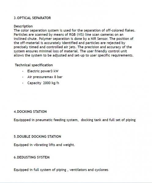 univerzální optický třídič / separátor - linka Cimbria SEA CHROMEX 3 (výrobce Dánsko) roky demontováno - uskladněno montáž, test i transport pouze po dohodě rok: 2018 3-cestný 3 vibrační podavače rozlišení dle 3. barev možnost nastavení třídění dle barevného spektra nebo dle tvaru třídící a vážící systém šikmý skluz full-colour RGB kamery led světelný systém 54 vystřelovacích vzduchových trysek na každém skluzu automatický re-sort dotykový displej spotřeba vzduchu při 4barech = 25.2 napájeníV/Hz: 230/50 - 1Ph (L + N + PE) max. spotřeba energie: kVa 1.5 možno k třídění plastových drtí dle barev (PET flakesy) nebo např. granulátu (potraviny, káva) konstrukce plnění do big bagu s vahou Prodej celého zařízení včetně: (nosné konstrukce, kompresoru, násypky, výsypky, magnetického separátoru a dopravních cest pro materiál) ***** Cena + DPH! lokace: severní Morava ID 1732103103_S ******* Máte zájem o tuto třídící linku? Kontaktujte mě a ráda Vám sdělím podrobnosti. Simona Zeman Galleová Tel: +420 732 712 973 Volejte od Po-Pá/9-17hod nebo pište. (i whatsapp) **** Možno výhodně financovat. Financování - prodej na splátky již od 0% akontace - podmínka delší podnikatelská historie, plusové účetnictví a nulové dluhy v registrech. separátor, separace plastu, potravin, granulátu, třídící linka, třídič, PET flakesy #czechmat #bazarbagru #pouzitatechnika #usedmachinery #gebrauchtemaschinen #bazarstrojuteplice #maszynybudowlane #bagryteplice