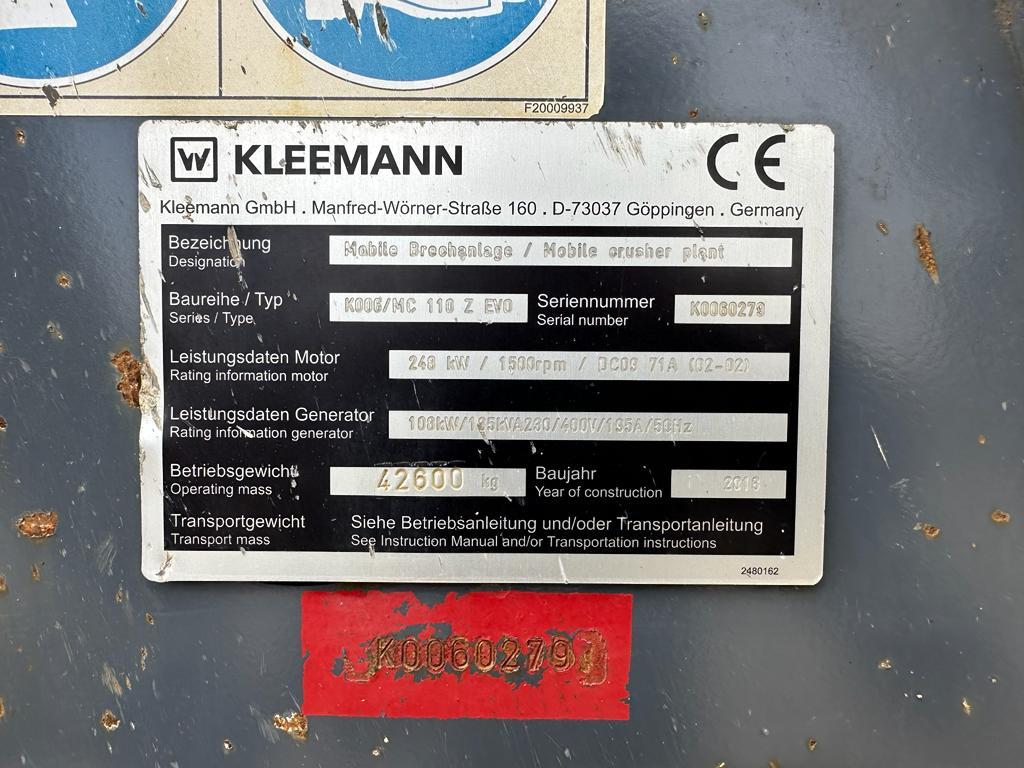 2018 Kleemann MC110Z EVO Jaw Crusher for sale. FEEDING UNIT Feed capacity: 330t/h Feed size max.: 990 x 620mm Feed height: 3600mm (4160mm with extensions) Width x length: 1900 x 3200 mm (3200 x 3600 mm with extension) Hopper volume: 3.7m3 (8.4m3 with extension) VIBRATING FEEDER Width x Length: 900 x 3680 mm PRESCREENING Type: Double-deck heavy-piece screen Width x Length: 1000 x 1830mm CRUSHER Crusher inlet width x depth: 1100 x 700 mm CRUSHER DISCHARGE CONVEYOR Width x Lenght: 1000 x 9200 mm Discharge height approx.: 3270 mm POWER SUPPLY Scania (Tier3/StageIIIA) diesel engine, generator 135kVA MAGNET BELT = More information = Power: 248 kW (337 HP) Empty weight: 42.600 kg Emissions / Stage: Tier 3 / Stage IIIA