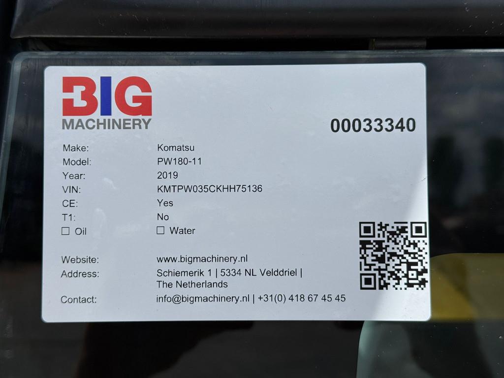 Used Komatsu PW180-11 Wheeled Excavator – 2019 – CE Certified / EPA Marked | For Sale at BIG Machinery This Komatsu PW180-11 wheeled excavator is now available for sale at BIG Machinery in the Netherlands. The machine is from 2019 and has 3,411 operating hours. It is CE certified, EPA marked, and comes equipped with hammerlines. With a total operating weight of 18,800 kg, this versatile machine offers the reliability and performance Komatsu is known for — ideal for earthmoving, roadwork, and general construction applications. - Condition: Used - CE Certified / EPA Marked - Year: 2019 - Operating hours: 3,411 - Operating weight: 18,800 kg - Engine: Komatsu SAA6D107E-3-A - Emissions / Stage: EU Stage V - Power: 130 kW - Hammerlines - Check valves Interested in this Komatsu PW180-11? Contact BIG Machinery for more information, inspection details, or a quotation. We deliver worldwide and can arrange complete export documentation and transport from our headquarters in the Netherlands. Why Choose BIG Machinery? At BIG Machinery, you benefit from over 30 years of experience in trading new and used machines. With our headquarters in the Netherlands, a dedicated team, and extensive expertise in global transport, we ensure reliable and fast delivery worldwide. We stand out with competitive pricing, carefully selected machine quality, and the assurance of a long-term partnership. Quality, speed, and reliability – Buy BIG! = More information = Empty weight: 18.800 kg