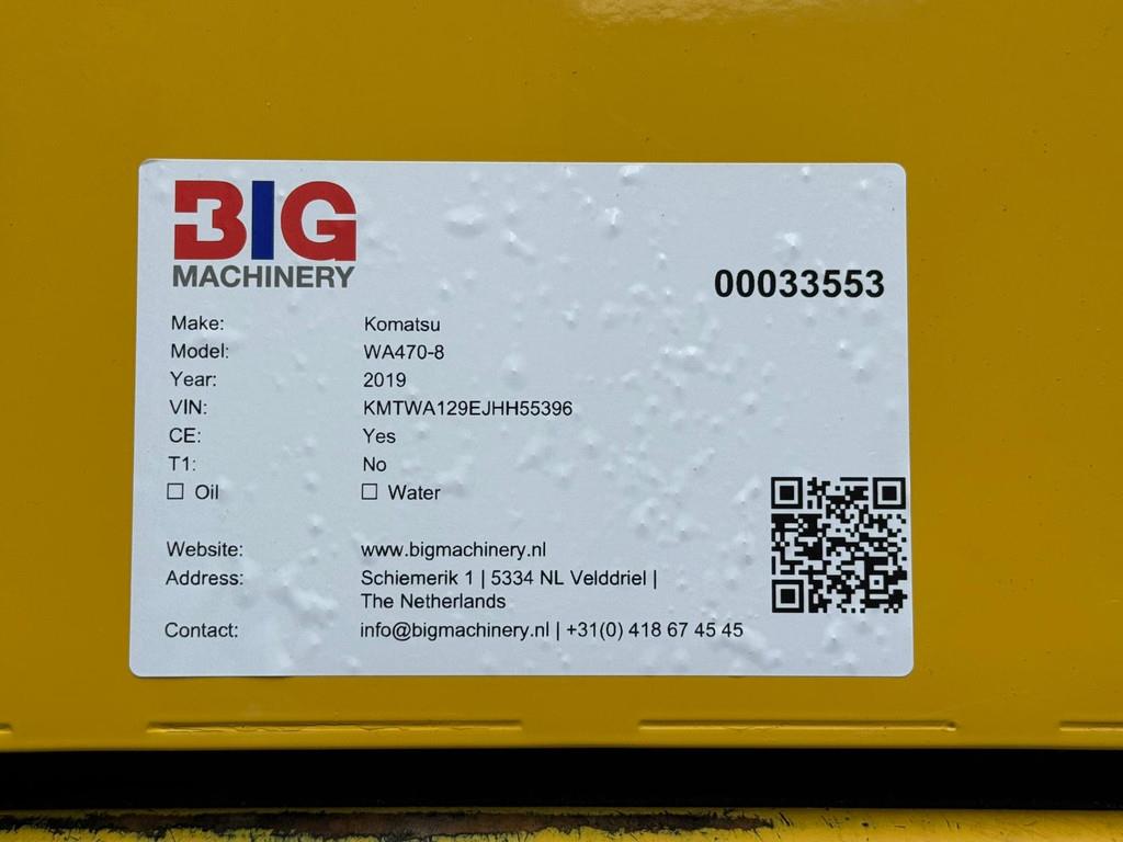 Used Komatsu WA470-8 Wheel Loader – 2019 – For Sale at BIG Machinery This Komatsu WA470-8 wheel loader, built in Germany in 2019, is available for sale at BIG Machinery in the Netherlands. The machine is CE certified and equipped with a 3,000 mm edge bucket, auto lubrication system, reverse camera, and an air-conditioned cabin, making it well suited for heavy-duty loading and industrial applications. With 12,958 operating hours, this loader offers reliable performance and operator comfort. • Year: 2019 • Condition: Used • Country of manufacture: Germany • Certification: CE certified • Operating hours: 12,958 • Cabin: Air-conditioned • Reverse camera • Auto lube system • 3,000 mm edge bucket Interested in this Komatsu WA470-8? Contact BIG Machinery for more information, inspection details, or a quotation. We deliver worldwide and can arrange complete export documentation and transport from our headquarters in the Netherlands. Why Choose BIG Machinery? At BIG Machinery, you benefit from over 30 years of experience in the trade of new and used machines. With our headquarters in the Netherlands, a dedicated and cohesive team, and extensive expertise in sea transport, we ensure reliable and fast delivery worldwide. We offer competitive market prices, carefully selected machine quality, and the assurance of a long-term partnership. With our own transport services, we provide seamless and efficient support from start to finish. Choose BIG Machinery as your trusted partner and discover why we are the preferred choice for customers worldwide. Quality, speed, and reliability – Buy BIG! = More information = Empty weight: 26.750 kg Width: 300 cm